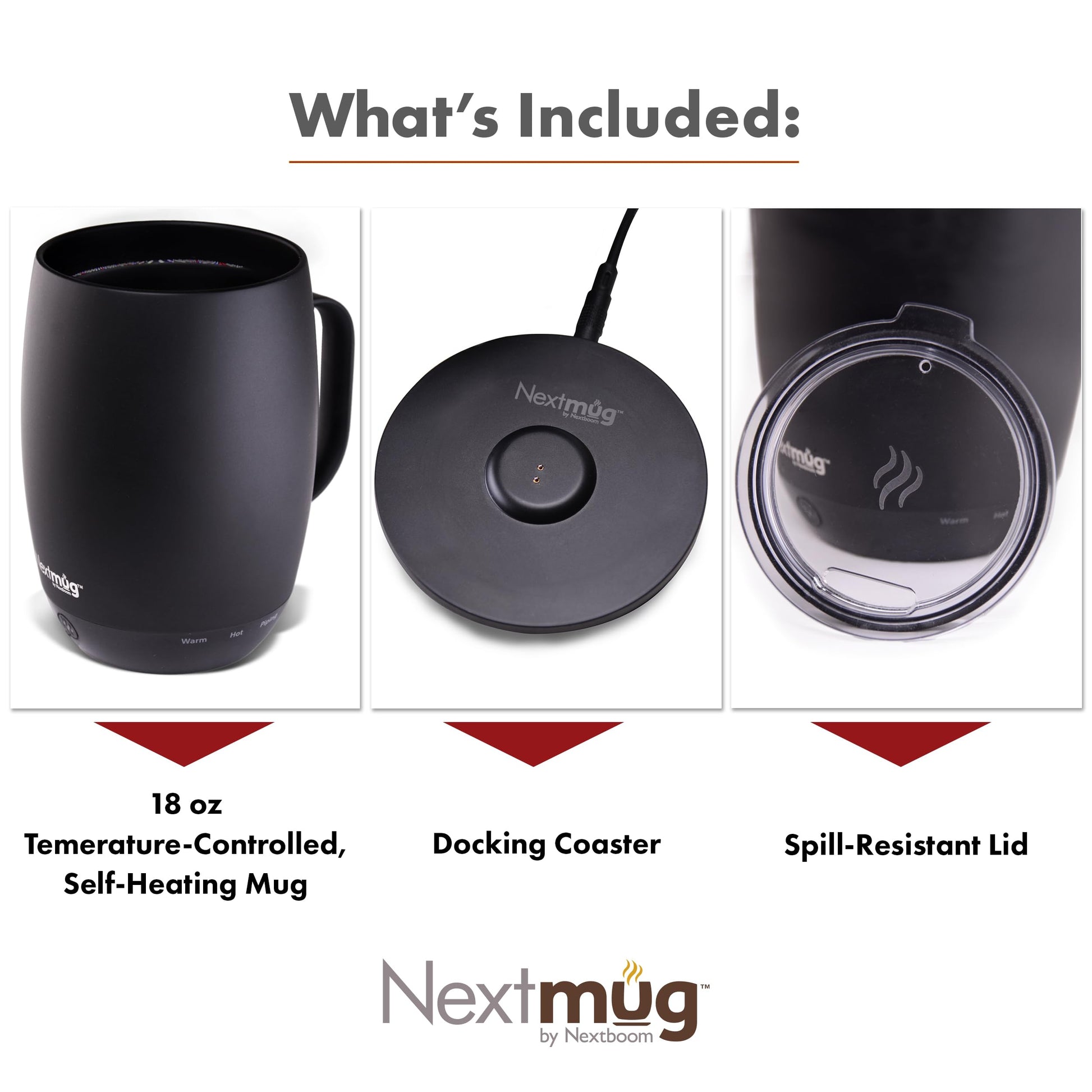 - WHAT'S INCLUDED - (1) 415 mL Nextmug; (2) Docking Coaster & 1.8 meters cord to charge the lithium-ion battery inside the Nextmug; (3) Spill-Resistant Lid to keep hot liquids in the mug and help maintain the ideal temperature for longer periods of time. All Nextmugs are fully compatible, including mugs, lids, docking coasters and accessories.