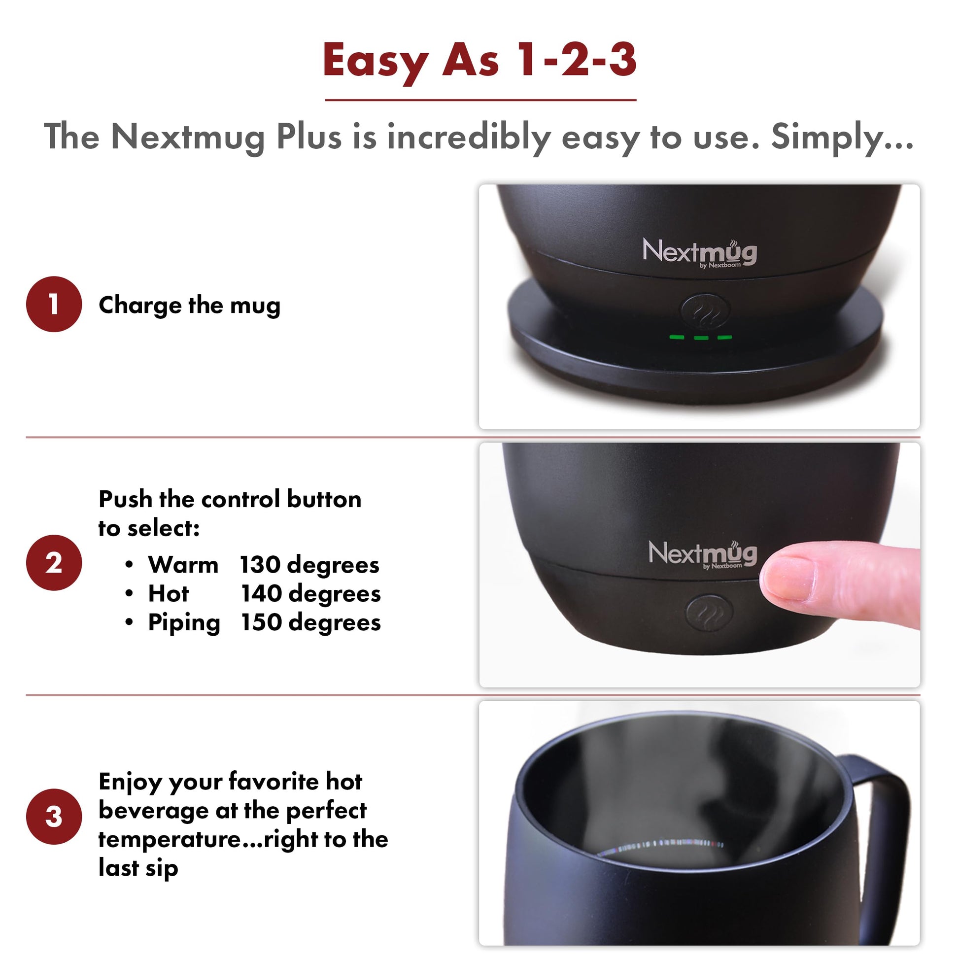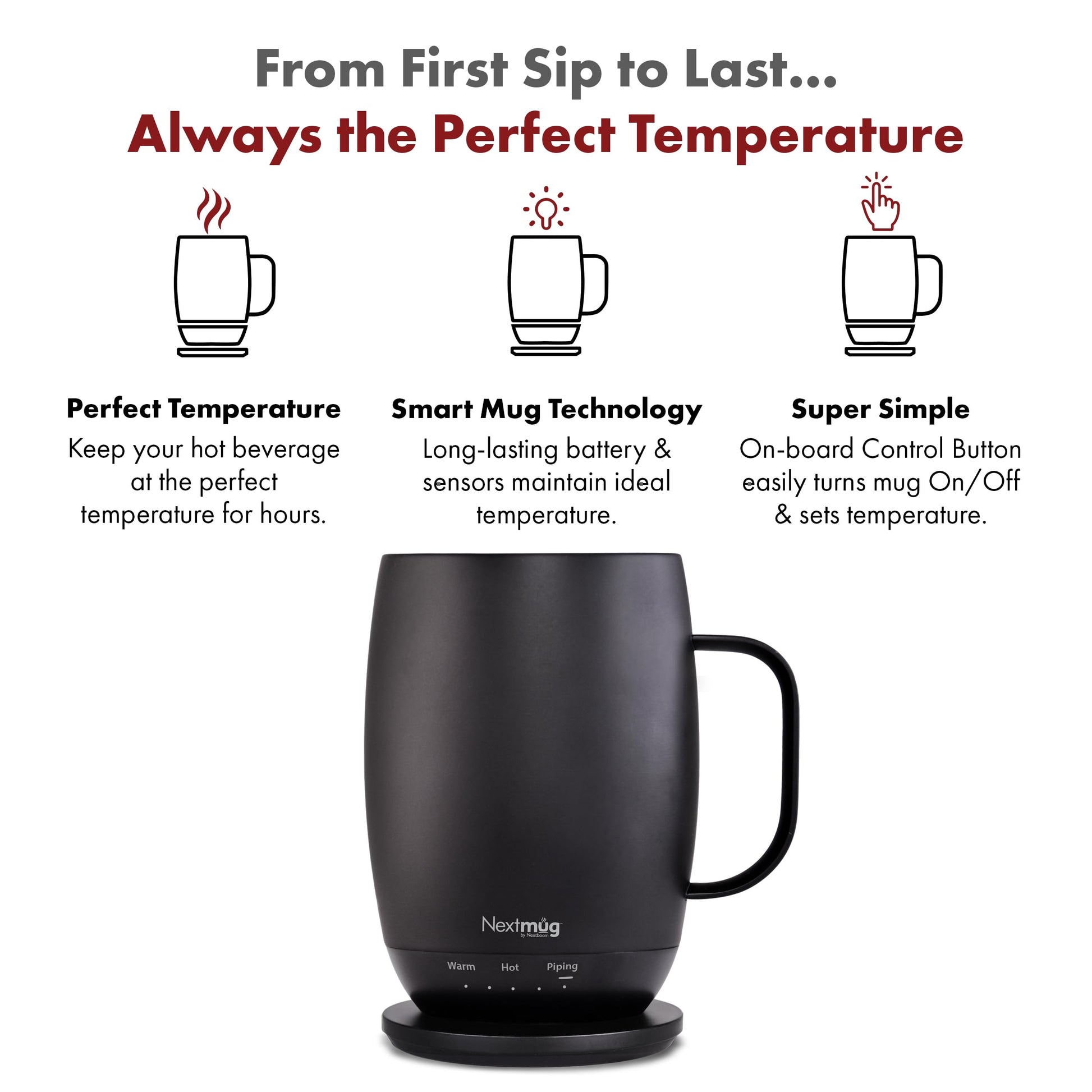 - ALWAYS THE PERFECT TEMPERATURE - The Nextmug will keep your hot coffee, tea or preferred beverage at the perfect temperature wherever you are. Simply select Warm (55°C), Hot (60°C), or Piping (65°C) and enjoy for hours.